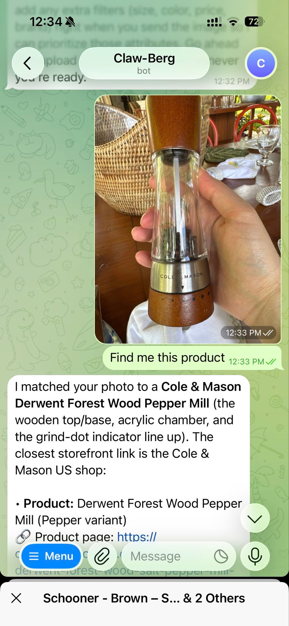 As shown in the screenshot below, Gil connected his OpenClaw bot directly to the Catalog API for image search. This time, the integration took just 60 seconds using codex-5.1-mini. Gil can now send a picture to his OpenClaw bot, type “Find me this product”, and instantly receive a link to buy it.