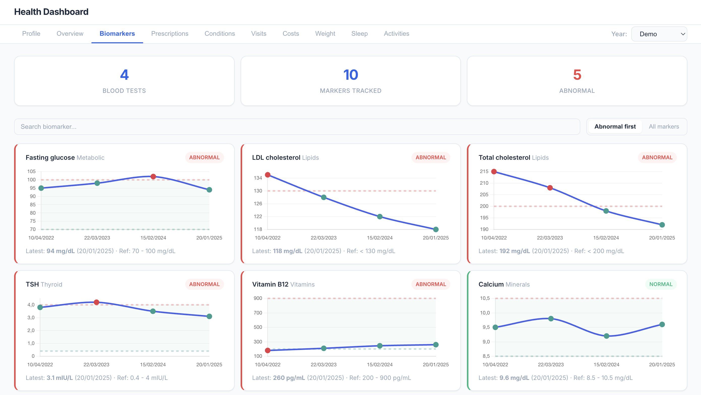 What I find genuinely useful isn't any single data point. It's the longitudinal view. Seeing my biomarkers evolve over the years, how my sleep holds up across seasons, what I actually spend on healthcare by specialty. So many questions get answered by this simple view.